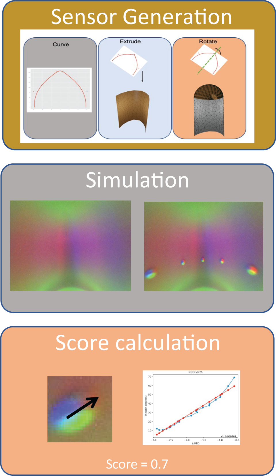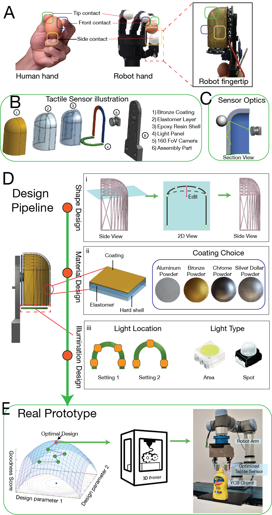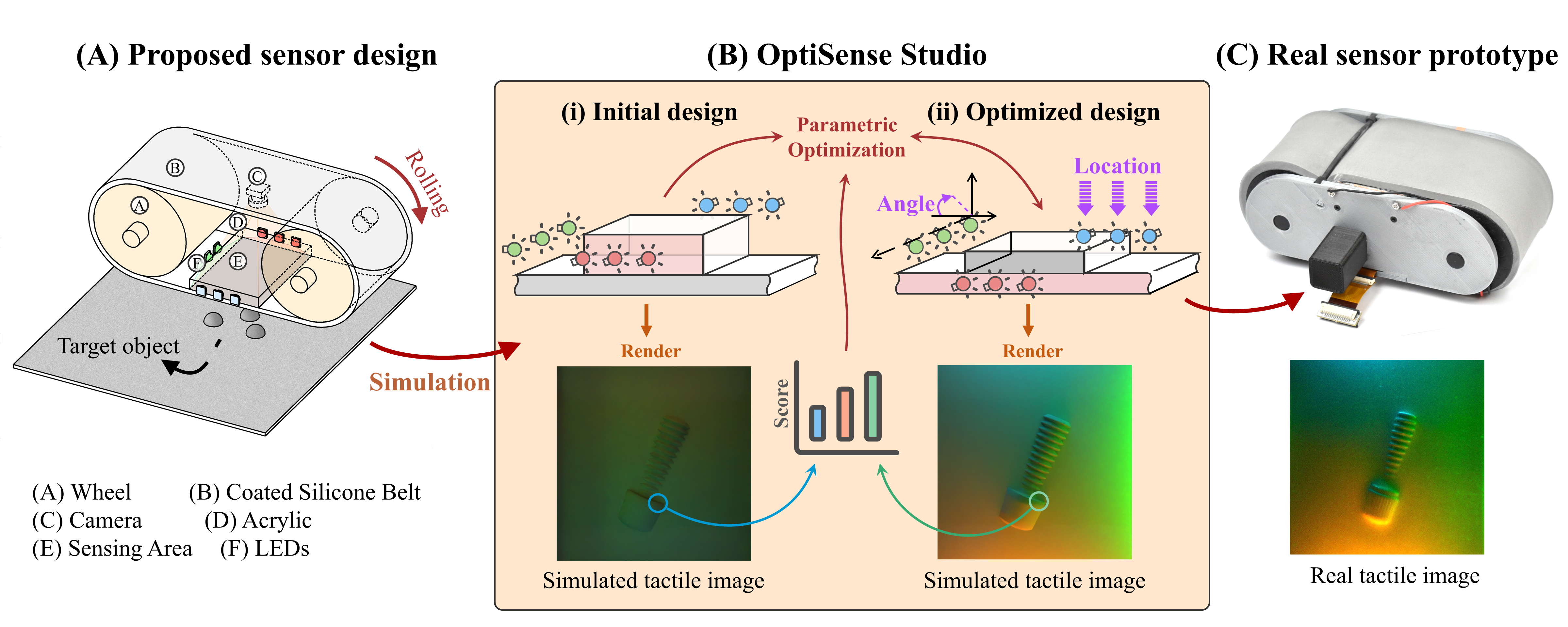 GelSight family of vision-based tactile sensors has proven to be effective for multiple robot perception and manipulation tasks. These sensors are based on an internal optical system and an embedded camera to capture the deformation of the soft sensor surface, inferring the high-resolution geometry of the objects in contact. However, customizing the sensors for different robot hands requires a tedious trial-and-error process to redesign the optical system. In this paper, we formulate the GelSight sensor design process as a systematic and objective-driven design problem and perform the design optimization with a physically accurate optical simulation. The method is based on modularizing and parameterizing the sensor’s optical components and designing four generalizable objective functions to evaluate the sensor. We implement the method with an interactive and easy-to-use toolbox called OptiSense Studio. With the toolbox, non-sensor experts can quickly optimize their sensor design in both forward and inverse ways following our predefined modules and steps. We demonstrate our system with four different GelSight sensors by quickly optimizing their initial design in simulation and transferring it to the real sensors.