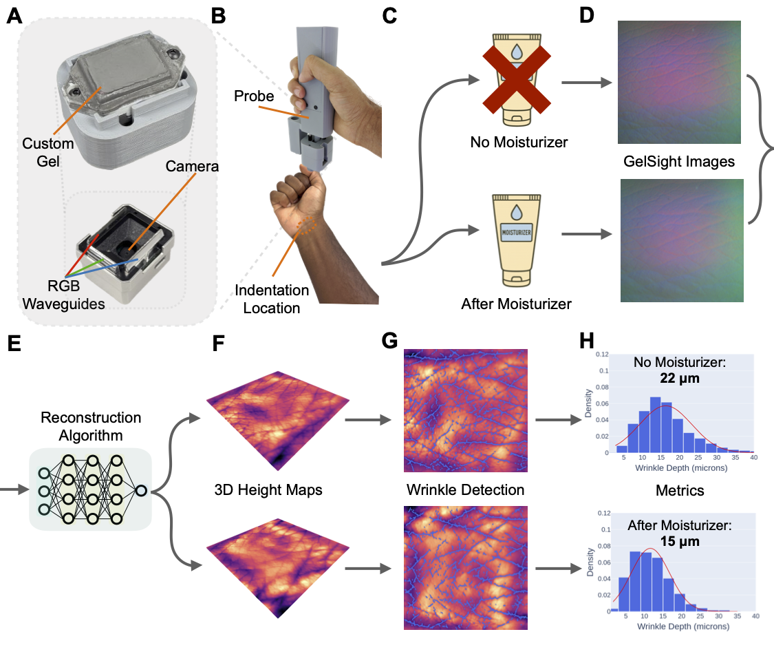Three-dimensional (3-D) skin surface reconstruction offers promise for objective and quantitative dermatological assessment, but no portable, high-resolution device exists that has been validated and used for depth reconstruction across various body locations. We present a compact 3-D skin reconstruction probe based on GelSight tactile imaging with a custom elastic gel and a learning-based reconstruction algorithm for micron-level wrinkle height estimation. Our probe, integrated into a handheld probe with force sensing for consistent contact, achieves a mean absolute error of 12.55 micron on wrinkle-like test objects. In a study with 15 participants without skin disorders, we provide the first validated wrinkle depth metrics across multiple body regions. We further demonstrate statistically significant reductions in wrinkle height at three locations following over-the-counter moisturizer application. Our work offers a validated tool for clinical and cosmetic skin analysis, with potential applications in diagnosis, treatment monitoring, and skincare efficacy evaluation.