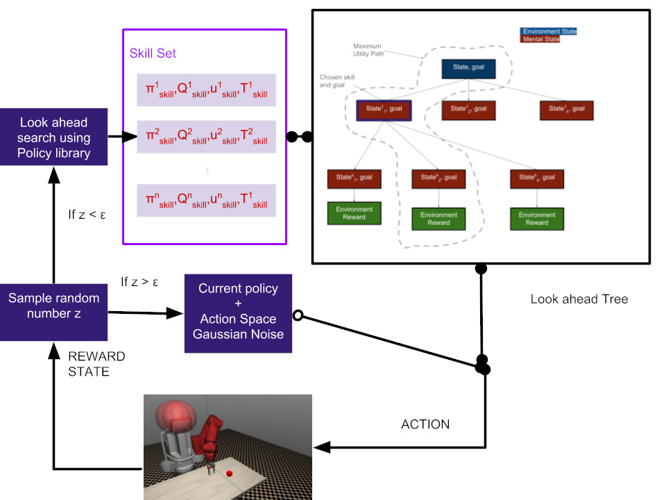 We propose an exploration method that incorporates look- ahead search over basic learnt skills and their dynamics, and use it for reinforcement learning (RL) of manipulation poli- cies . Our skills are multi-goal policies learned in isolation in simpler environments using existing multigoal RL formula- tions, analogous to options or macroactions. Coarse skill dy- namics, i.e., the state transition caused by a (complete) skill execution, are learnt and are unrolled forward during looka- head search. Policy search benefits from temporal abstrac- tion during exploration, though itself operates over low-level primitive actions, and thus the resulting policies does not suf- fer from suboptimality and inflexibility caused by coarse skill chaining. We show that the proposed exploration strategy results in effective learning of complex manipulation poli- cies faster than current state-of-the-art RL methods, and con- verges to better policies than methods that use options or parametrized skills as building blocks of the policy itself, as opposed to guiding exploration. We show that the proposed exploration strategy results in effective learning of complex manipulation policies faster than current state-of-the-art RL methods, and converges to better policies than methods that use options or parameterized skills as building blocks of the policy itself, as opposed to guiding exploration.